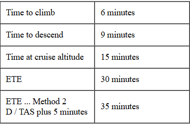 = 54.5 nm. / 110 kts. = 0.495 hrs. or 30 minutes. Add 5 minutes for climb and descend. With this method, the calculated ETE is 35 minutes; 5 minutes longer than the "precise" calculation. For longer flights, this second method of calculation becomes more accurate.