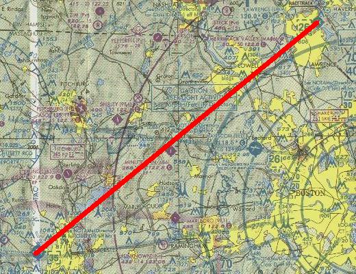 Can't worry about that now. The flight originates at Lawrence, Mass., airport ID KLWM, then southwest to Worcester, airport ID KORH. Time to plot it and move on.