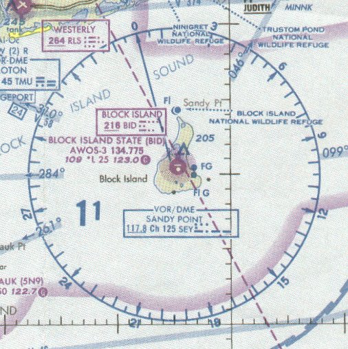 Note the Sandy Point VOR in the illustration at Block Island. The isogonic line passing right over the airport is 15° west. Since it is a west variation, magnetic north points west of true north, and that is evident in the illustration.