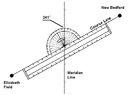 The compass heading from New Bedford to Elizabeth Field will then be 256°, or 241° true course plus 15° magnetic variation west.