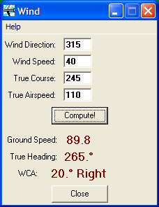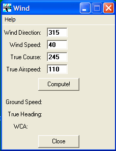 For ease, simplicity, accuracy, and speed, the flight-simmer should try the virtual E6-B. It is a freeware software program that calculates the Wind Correction Angle, Ground Speed, and a host of other things. See the illustrations below for the calculations just performed using the wind triangle.