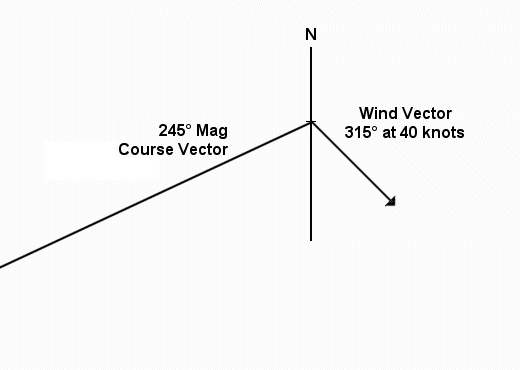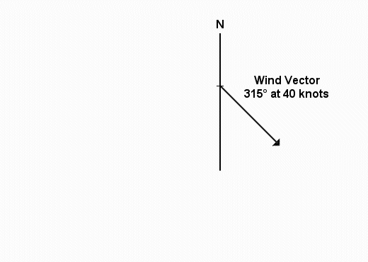 2. Next draw the vector for the wind. Use any scale, but keep it consistent for all vectors. I find 1 mm = 1 kt a workable scale. Wind FROM the north-west, 315°, is wind going TO the south-east. Measure all angles carefully.
