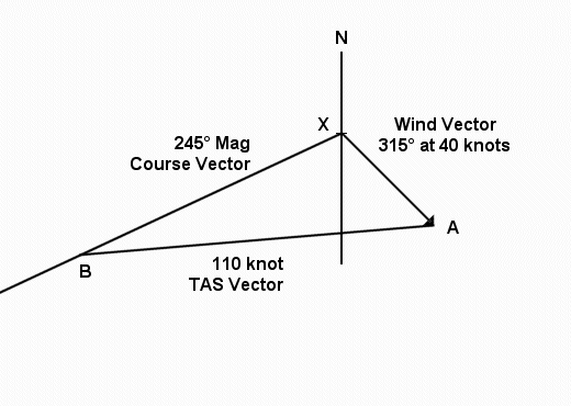 5. Measure the distance along the Magnetic-Course vector, from point X, the origin, to point B, where the TAS vector intersects. This distance is the aircraft's Ground Speed. In this case, it is 90 knots.