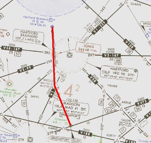 The LDA approach at Brainard is to Runway 2. Click on the image above to download the flight-information package, chstr-hfd.zip. The zip-file includes the IFR chart, the approach plate for LDA Rwy 2 at Hartford-Brainard, and this text description of the flight.
