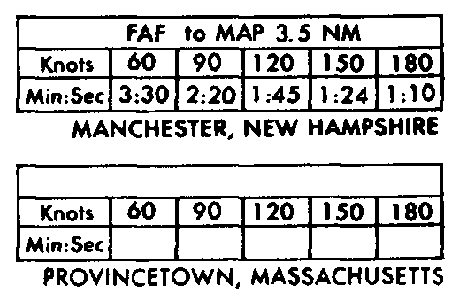 Two significant differences are notable on Provincetown's approach plate vs. the ones used up 'til now. There is no FAF, and the table of times from FAF to the MAP is blank. Since the NDB is on the field, it can't be the Final Approach Fix, hence there can be no times for FAF to the MAP.