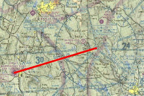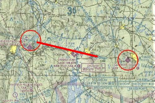 The first flight will be from Great Barrington, Mass. to the Chester VOR, 21.2 nm distant. Chester VOR is 115.10 MHz. Tune the Nav receiver to the CTR VOR before takeoff and turn on the ident switch to permit hearing the Morse code identifier when the Omni is received (Click center-portion of radio face). Depart from Runway 11 and climb to 5500 ft. After receiving and verifying the ident signal (Click center-portion of radio face) rotate the OBS until the needle centers and the TO-FROM flag is in the TO position. The flag may not appear until a few seconds after hearing the ident.