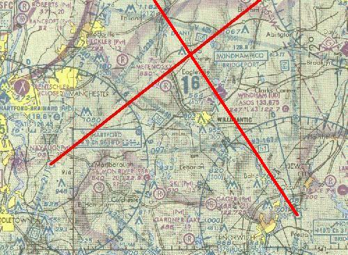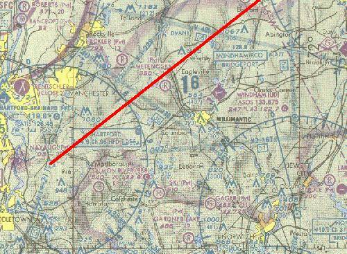 We locate our position by triangulation. We'll use the Hartford, HFD, 114.9 MHz VOR to the west and the Norwich, ORW, 110.0 MHz VOR to the east as our reference points.