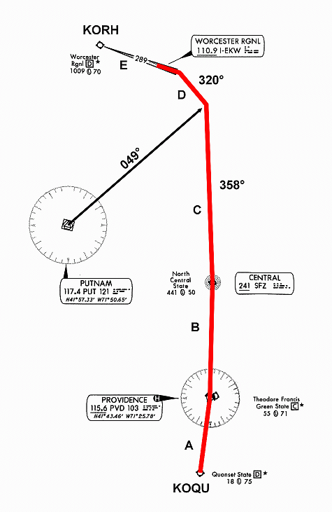 This flight, from Quonset State Airport, KOQU, in North Kingstown, R.I. to Worcester, Mass., KORH, gathers together many of the lessons learned so far relating to both NDB and VOR Navigation. It?s an interesting flight because the navigation requirements of each leg are different. There are five legs labeled A to E on the KOQU-KORH Route Map. Your cruise speed will be 110 kts, and climb should be 90 kts. Total distance is 50 nm. Your cruise altitude will be 3000 ft. Turn on all aircraft lights for the departure, and switch off the landing and taxi lights after takeoff. The flight is about 30 minutes.