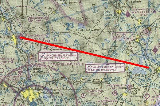The Flight, KPSM to KCON Your flight is from Pease Int'l Tradeport, Portsmouth, N.H. to Concord (N.H.) Muni Airport. A strong cold front came through a few hours ago, leaving crystal-clear skies and a very strong wind of 28 kts. from 345°. You will depart from Runway 34, intercept the Concord 119° radial and land at Concord on Runway 35. The distance between the two cities is 31 nm. Pease field elev. is 98 ft., and Concord is at 344 ft. Cruise at 4500 ft. Flight time is about 22 minutes.