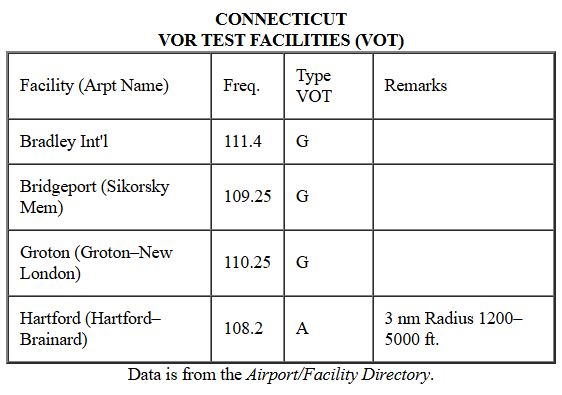 To calibrate a VOR, the pilot tunes in the VOT frequency while on the ground (in rare instances this check is performed in the air). Refer to the back of the Airport/Facility Directory for frequencies and whether it is a ground check (G) or an airborne check (A). See the Connecticut illustration below.
