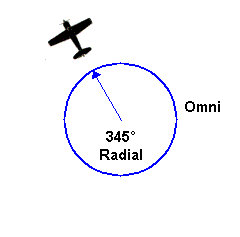 NOTE this very important fact, with more info farther down. The radial signals of a VOR always point away from the station. The indicator below shows 345°, but since we are heading toward the VOR, see arrow D, we are actually on the reciprocal radial, or the 165° radial. This aircraft is south of the station. This will become more clear in a moment.